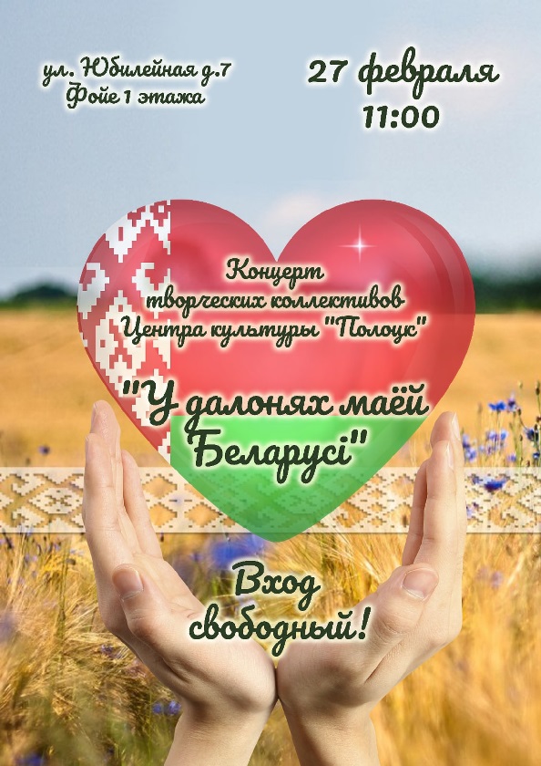 В этот особенный и важный день Центр культуры «Полоцк» приглашает всех на патриотический концерт «У далонях маёй Беларусi». Для вас выступят творческие коллективы нашего Центра.