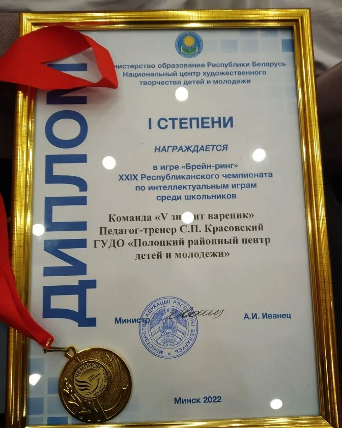 Чемпионом Республики Беларусь в игре «Брейн-ринг» стала команда интеллектуального клуба «Паллада» Полоцкого районного центра детей и молодежи (педагог Сергей Красовский).