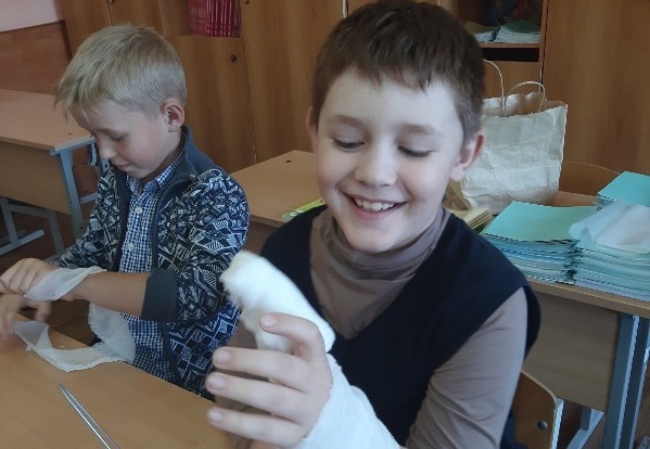 А сотрудники детской поликлиники г. Полоцка провели для школьников мастер-класс по перевязкам.