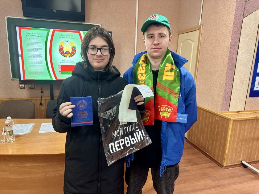Также волонтеры вручают впервые голосующим жителям Полотчины брендированные майки от БРСМ с надписью «Мой голос первый»! в рамках молодежной республиканской акции.
