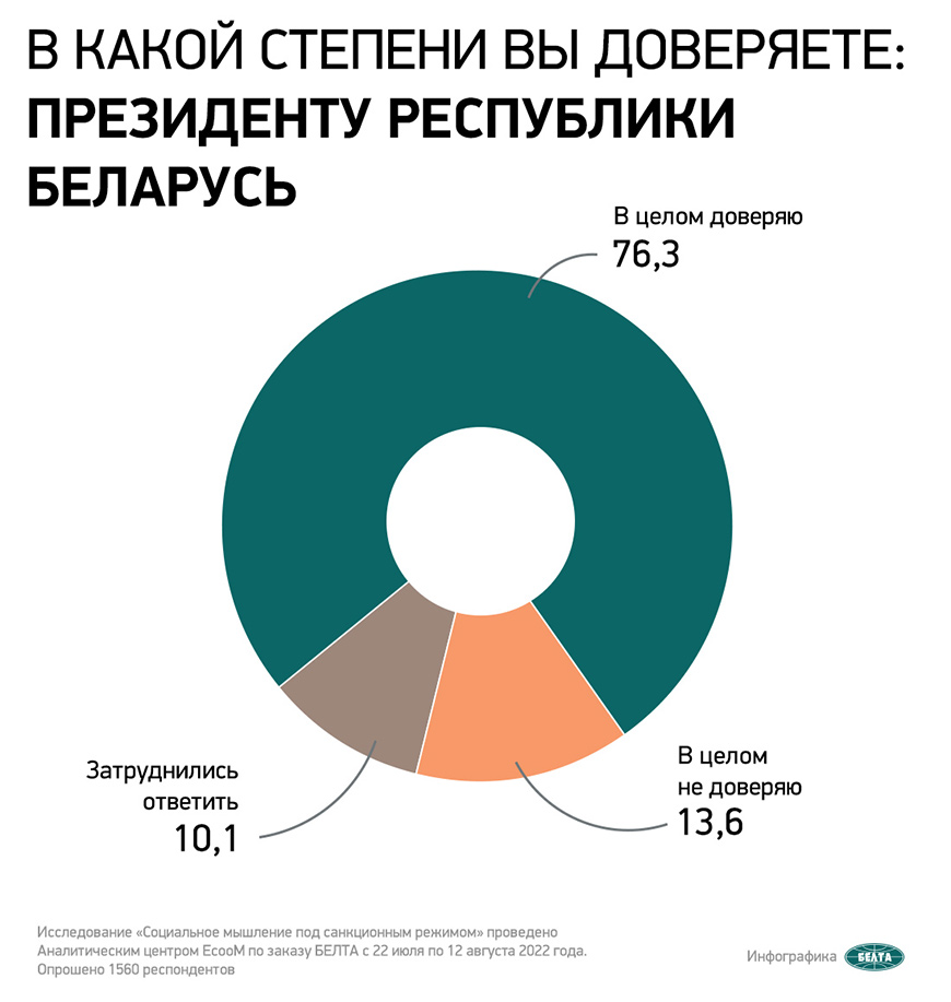 На вопрос «В какой степени вы доверяете Президенту?» 76,3% белорусов ответили «В целом доверяю», 13,6% — «В целом не доверяю», затруднились ответить 10,1%.
