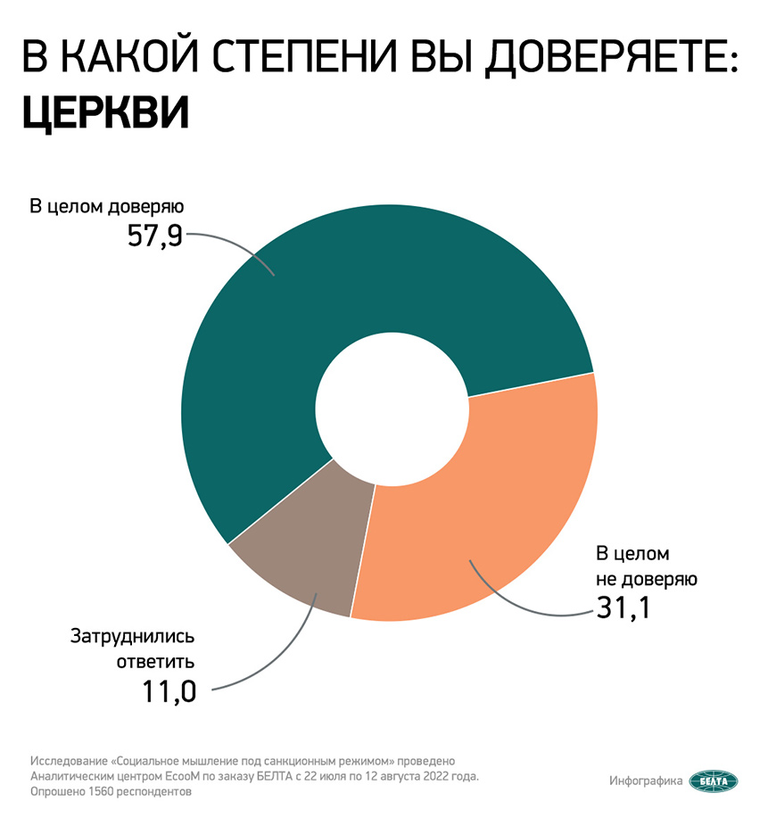 По данным исследования, церкви в целом доверяют около 60% белорусов.