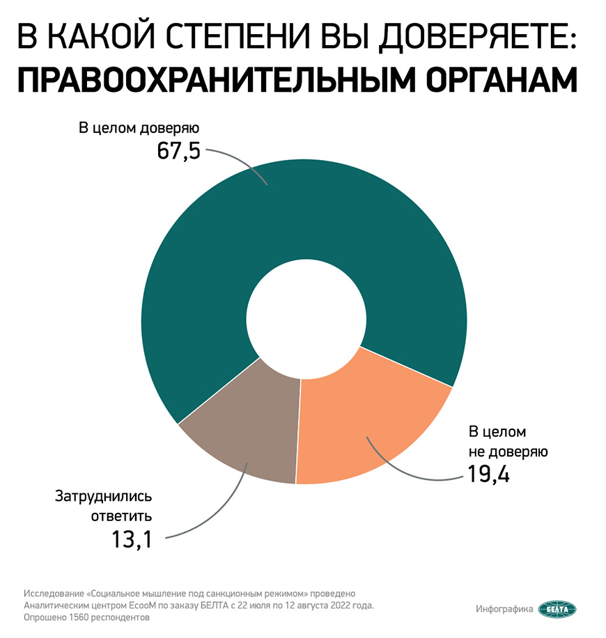 Социсследование также демонстрирует и рост доверия к правоохранительным органам. Так, в целом доверяют правоохранительным органам 67,5% белорусов, в целом не доверяют — 19,4%, затруднились ответить 13,1% респондентов.