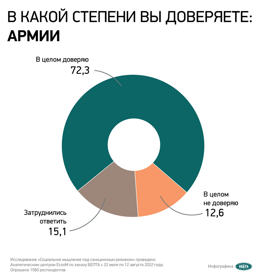 Еще один вопрос социсследования: «В какой степени вы доверяете армии?» «В целом доверяю» — так ответили 72,3% белорусов, «В целом не доверяю» — 12,6%, затруднились ответить 15,1%.