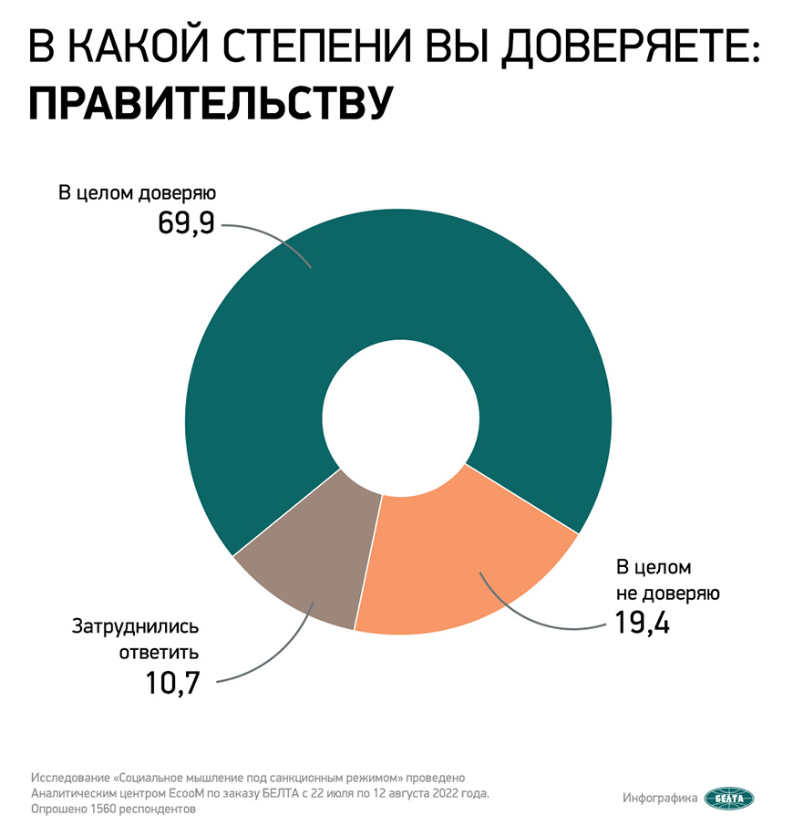 Респондентам также предлагалось ответить на вопрос «В какой степени вы доверяете правительству?» «В целом доверяю» — так ответили 69,9% белорусов, «В целом не доверяю» — 19,4%, затруднились ответить — 10,7%.