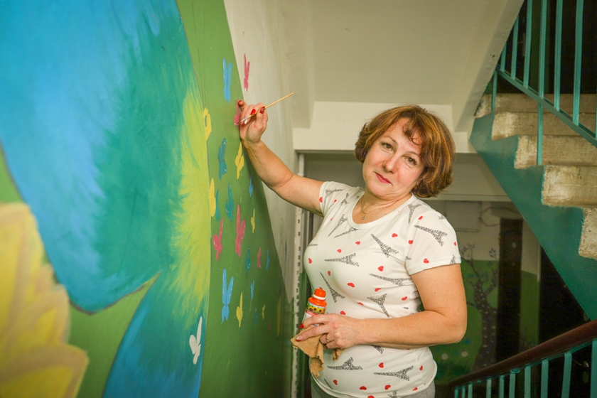 Открываем входную дверь и попадаем в художественную галерею, которая идет через все площадки и лестничные пролеты. Собственно говоря, мы здесь именно за этим — полюбоваться, вам показать сей дизайн подъездного интерьера и познакомиться с главным инициатором и создателем настенной росписи Галиной Куриленко. Обаятельная и энергичная женщина выходит нам навстречу. За преображение подъезда взялась в прошлом году вместе с невесткой, которая рисовала эскизы, а Галина Георгиевна их раскрашивала, покупая за свои деньги краски и кисточки. Хотели чуть-чуть зелени добавить, но увлеклись. «По профессии я швея. Рисовать не умею», — говорит собеседница, но мы сомневаемся. В рисунках и цвета подобраны гармонично, и переходы колеров аккуратные, и вообще — радостью веет от таких художеств.