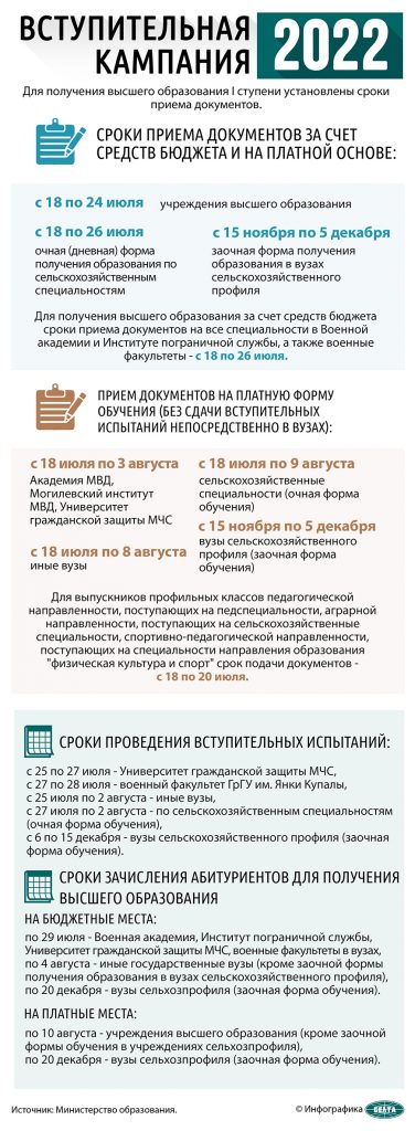 Для получения высшего образования за счет средств бюджета сроки приема документов на все специальности в Военной академии и Институте пограничной службы, а также военные факультеты — с 18 по 26 июля.