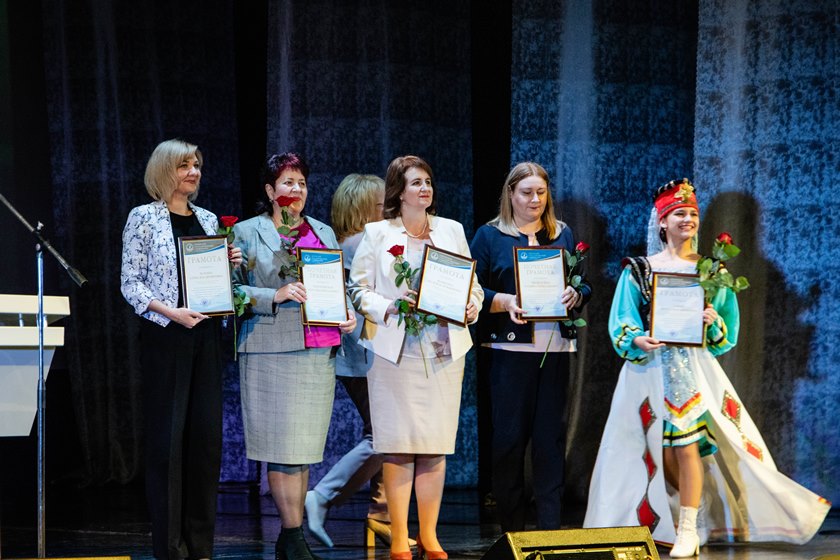 Ирина Анатольевна вручила заслуженные награды. Нагрудного знака Министерства образования Республики Беларусь «Отличник образования» удостоены Татьяна Артимёнок, заместитель директора по учебной работе, Снежана Булах, заместитель по учебно-производственной работе, Ирина Колач, заместитель директора по воспитательной работе, Ольга Кравченко, заведующий отделением «Дошкольное образование», Светлана Барановская, преподаватель психологии, председатель цикловой комиссии предметов дошкольного образования и физического воспитания.