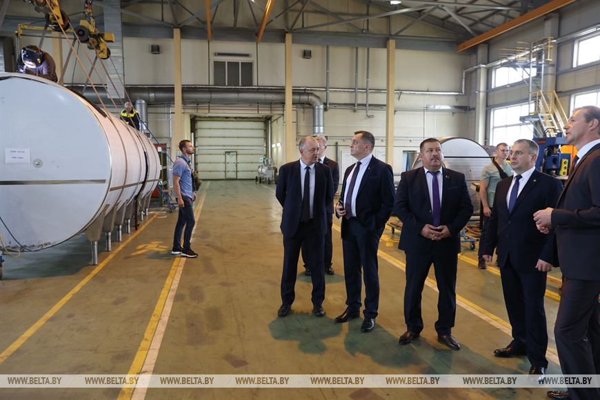 Руководитель северного региона Беларуси ознакомился с производственным процессом предприятия. Акцент был сделан и на том, как в Гомельской области организована система обслуживания предприятием доильных залов (а их более 340), над какими перспективами работает ОАО, обсуждались и аспекты локализации производства. Как подчеркнул Александр Стрибук, под каждый проект создается индивидуальная доильная установка. Постоянно идет работа по сервисному обслуживанию, ремонту, в том числе и танков охлаждения молока.