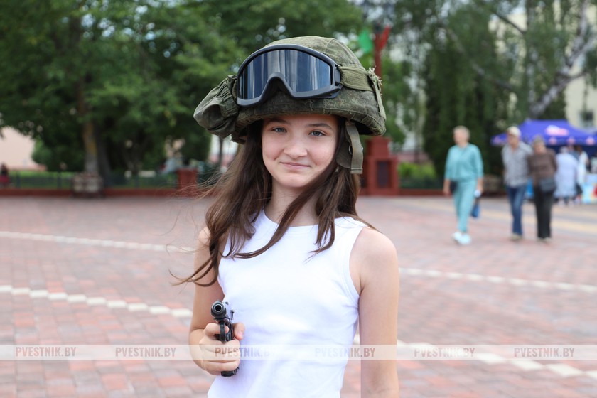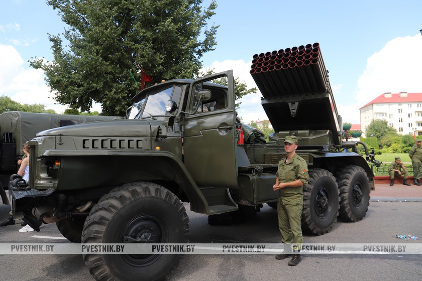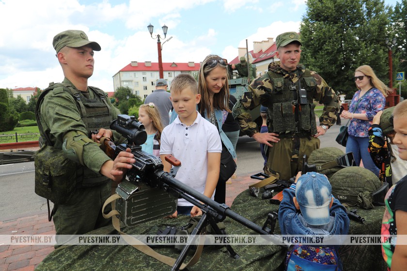 Привлекало внимание прохожих выставка военной техники и вооружения под открытым небом на площади Свободы. Экспонаты привезли из 19 отдельной гвардейской механизированной бригады в д.Заслоново. Это очередной подарок организаторов проекта «Дорогами славы».
