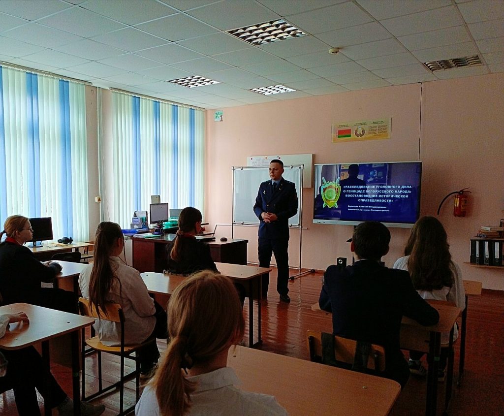 На уроке памяти разговор шел о геноциде белорусского народа в годы Великой Отечественной войны. Представитель прокуратуры рассказал о предварительных результатах расследования органами прокуратуры уголовного дела о геноциде.