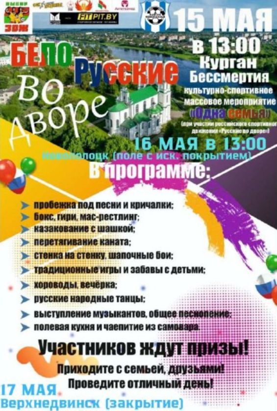 15 мая «БелоРусские во дворе» в Полоцке. В рамках укрепления дружбы между Россией и Беларусью будет проводиться культурно-массовое мероприятия «Одна семья», где специальными гостями станут участники спортивно-традиционного движения «Русские во дворе» из России.