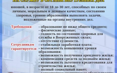 Продолжить чтениеОтдел внутренних дел Полоцкого райисполкома приглашает на службу в органы внутренних дел юношей, в возрасте от 18 до 30 лет, способных по своим личным, моральным и деловым качествам, состоянию здоровья, уровню образования выполнять задачи, возложенные на органы внутренних дел, годных к воинской службе.