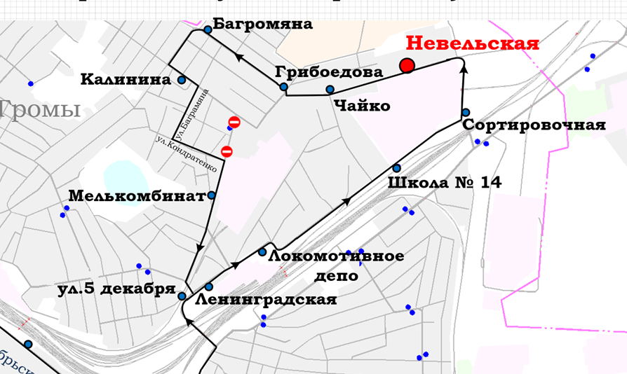 Движение по маршруту №12Тк «Электросети – Невельская» будет осуществляться без заезда на остановочный пункт «ул.Фабрициуса». После остановочного пункта «ул.Калинина» движение будет осуществляться по ул.Баграмяна и ул.Кондратенко до остановочного пункта «Мелькомбинат» и далее по маршруту.