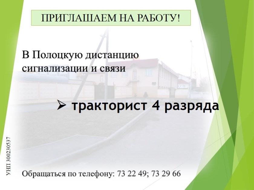 Полоцкая дистанция сигнализации и связи приглашает на постоянную работу тракториста 4 разряда.