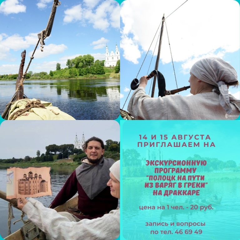 1. В выходные вы можете посетить экскурсионную программу «Полоцк на пути из варяг в греки». Драккар «Рубон» вновь ложится на курс. Экскурсия начинается каждый час: в 14.00, 15.00, 16.00, 17.00, 18.00 и 19.00.  Отправление от площадки возле Софийского собора. Драккар принимает на борт 6 пассажиров. И только по предварительной записи.