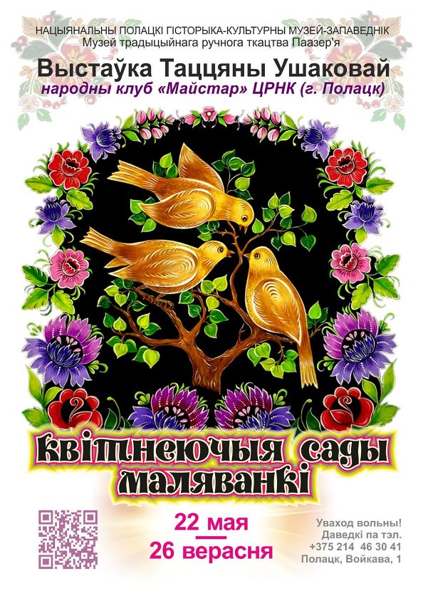 3.В музее традиционного ручного ткачества Поозерья вы можете посетить выставку современной маляванки «Квітнеючыя сады маляванкі». Выставка знакомит нас с талантливым современным мастером этого вида декоративно-прикладного искусства — Татьяной Ушаковой (народный клуб «Майстар» ЦРНК, г. Полоцк).