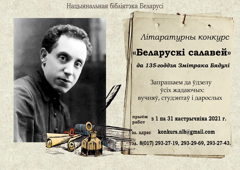 Да 135-годдзя з дня нараджэння Змітрака Бядулі з 1 па 31 кастрычніка 2021 года Нацыянальная бібліятэка Беларусі праводзіць літаратурны конкурс “Беларускі салавей”.