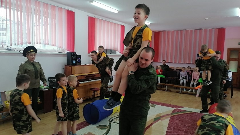 Накануне Дня защитников Отечества по традиции в гости к воспитанникам пришли военнослужащие полка радиоэлектронной борьбы и полоцкие кадеты. Вместе с мальчишками они участвовали в музыкально-спортивном празднике «Будем в армии служить!». Интересно подобранные конкурсы не оставили равнодушными ни стеснительных, ни серьезных. А после праздника воспитанников средних и старших групп ожидал сюрприз — с большим интересом ребята рассматривали каски, пистолеты, автоматы. Праздник состоялся!