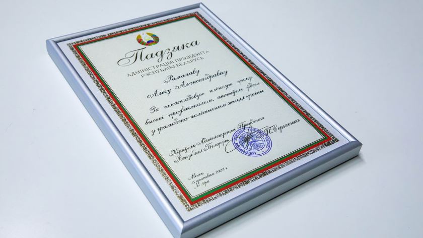 Анатолий Константинович Линевич вручил Олегу Александровичу Романову Благодарность Администрации Президента Республики Беларусь за многолетний плодотворный труд, высокий профессионализм, активное участие в общественно-политической жизни страны.