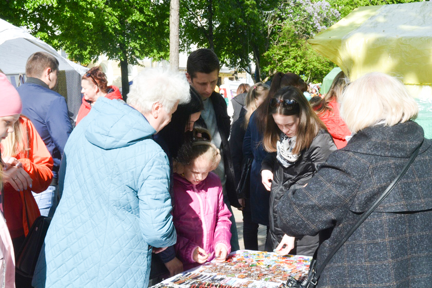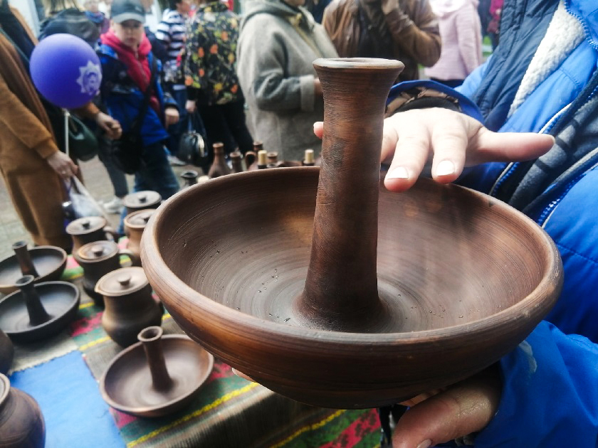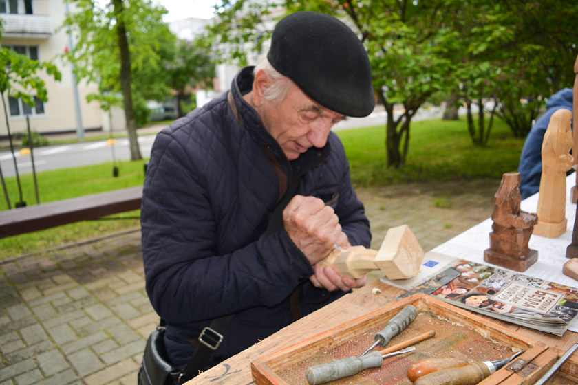 Изделия из дерева, керамики, глины, кожи… Некоторые мастера не только продавали товары, но и проводили увлекательные мастер-классы. Многие останавливались посмотреть, как работают резчики по дереву. Трое полочан — Александр Вериго, Николай Абраменко и Валентин Нагорный- на глазах у публики умело обрабатывали дерево и создавали уникальные изделия. Аншлаг был и у гончарного круга. Мастер Ниматулло Шарипов, самородок из деревни Германишки, гончарством занимается более 10 лет и даже придумал интересную кухонную утварь под названием «Курница»: посуда удобная, экологичная и практичная. А детишки спешили к мастерице из Полоцкого районного Центра ремесел и национальных культур Екатерине Зеленской, чтобы посмотреть, как делается полоцкая свистулька.
