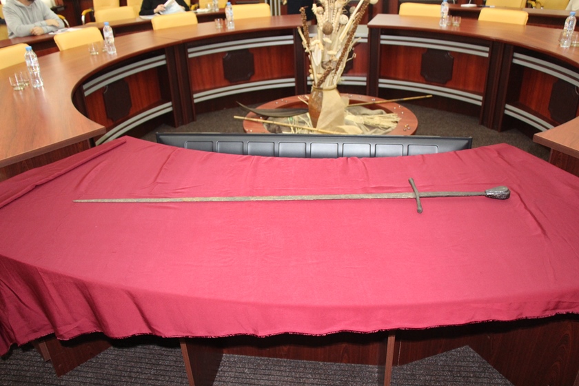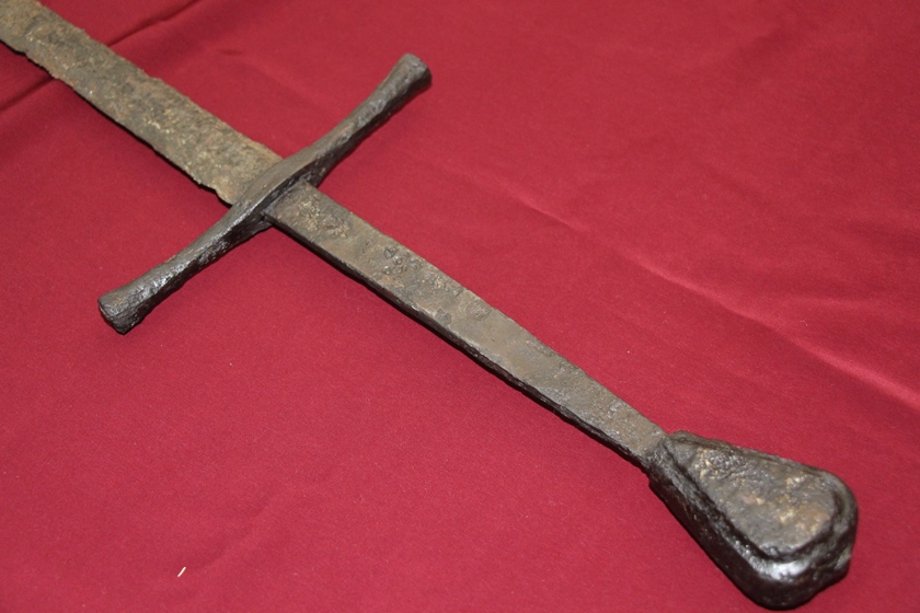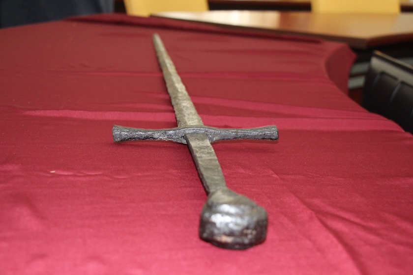 — Находка очень интересная, раньше у нас таких не было. Это своеобразная печать времени. Общая длина меча 128 см, примерно 1,6 кг. В результате исследования химического состава меча установлено, что лезвие и гарда изготовлены из закалённой высокоуглеродной стали, а навершие — из незакалённого железа. Материалом для изготовления инкрустации стала двухкомпонентная латунь без дополнительных примесей, — рассказал реставратор Александр Волков.