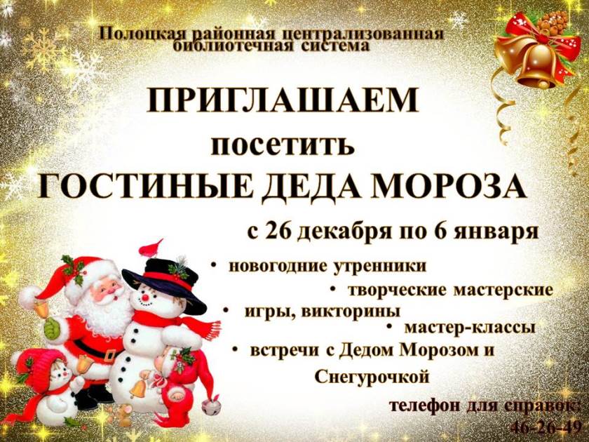 Полоцкие библиотеки приглашают жителей и гостей города и района посетить гостиные Деда Мороза, которые по традиции откроются с 26 декабря. И будут работать по 6 января включительно, кроме выходных.