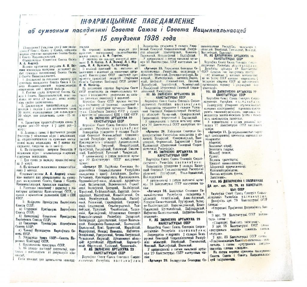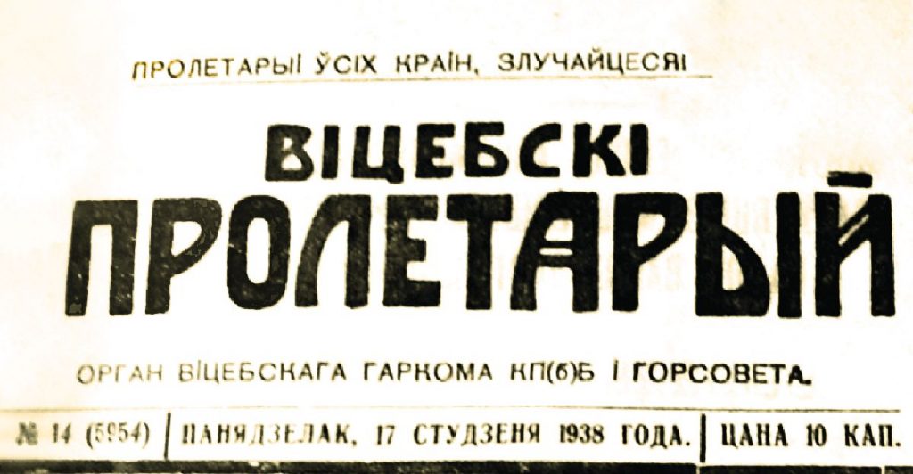 Собирая материалы о 85-летии со дня основания Витебской области, мы решили отыскать газету «Віцебскі пралетарый», выходившую в начале 1938 года. Подшивку мы нашли в Национальной библиотеке Беларуси. Хотя, когда ее заказывали из хранилища, нас предупредили, что нужного номера, а нас интересовал за 15 января, может и не быть. Но он присутствовал, правда, с надорванной первой полосой.