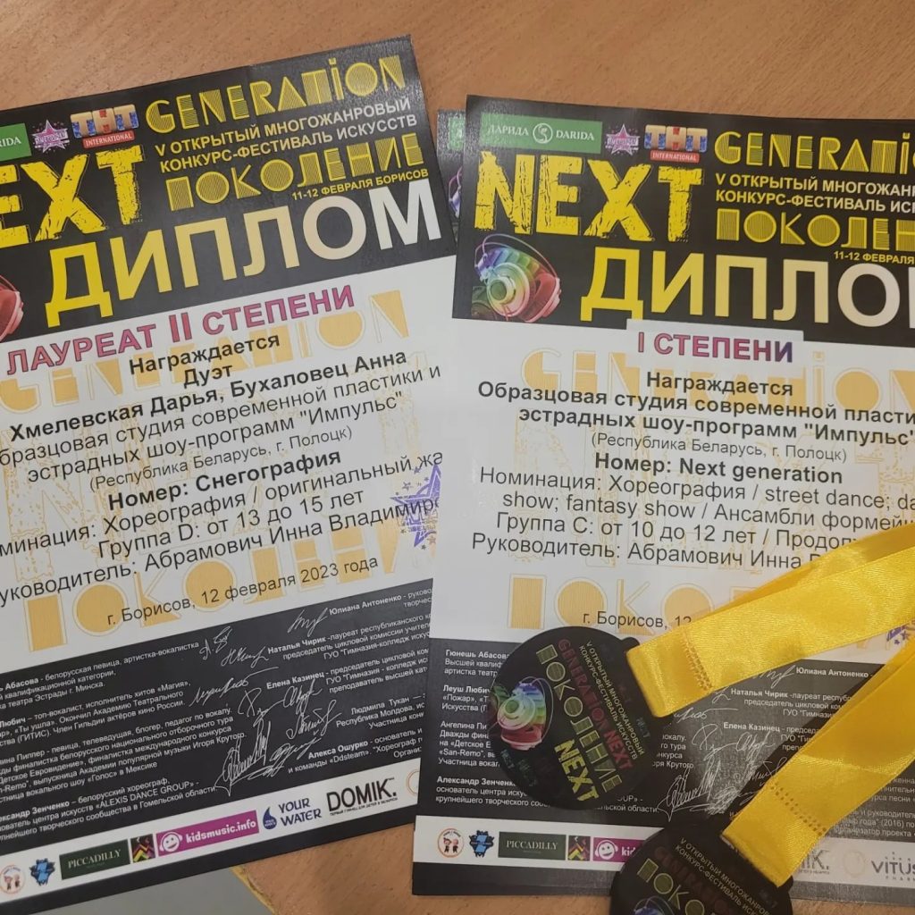 В Борисове прошел V Открытый многожанровый фестиваль искусств «ПОКОЛЕНИЕ NEXT», участие в котором приняли талантливые белорусы разных возрастов. Образцовая студия современной пластики «Импульс» СШ№8 под руководством Инны Абрамович на суд жюри представили два хореографических номера, которые стали победителями в своих возрастных категориях.