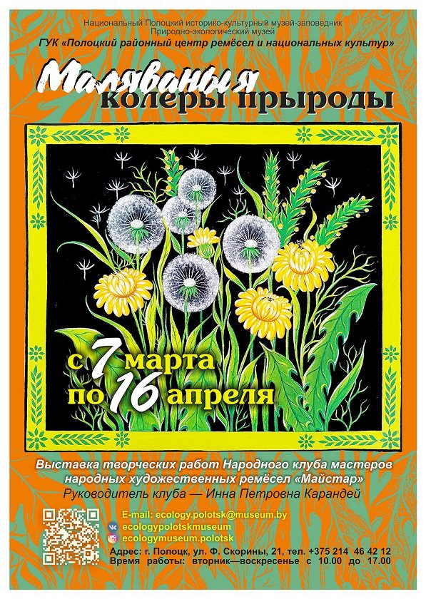 В Природно-экологическом музее пройдет выставка «Маляваныя колеры прыроды», на которой вы сможете познакомиться с творчеством Народного клуба мастеров народных художественных ремёсел «Майстар» Полоцкого районного Центра ремёсел и национальных культур (рук. Инна Карандей).