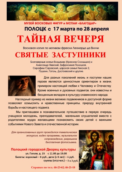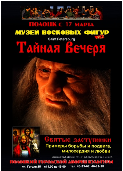 | Выставка восковых фигур “Тайна вечеря” по мотивам фрески Леонардо да Винчи, Санкт-Петербург. | По 28.04 | 11.00 – 19.00 | Взр. – 6 руб. Дет. – 4 руб. Для групп от 10 чел. – 5 и 3 руб. |