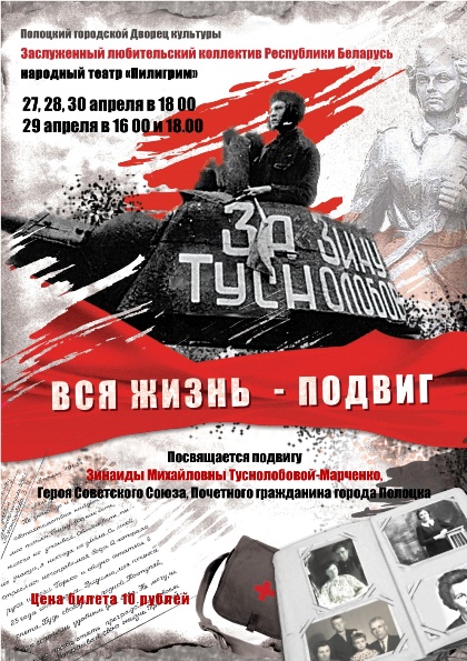 | Документально-художественная композиция «Вся жизнь — подвиг», посвящённая подвигу прославленной полочанки, Героя Советского Союза Зинаиды Михайловны Туснолобовой-Марченко, в постановке заслуженного любительского коллектива Республики Беларусь народного театра «Пилигрим» | 27.04 28.04 29.04 30.04 | 18.00 18.00 16.00,18.00 18.00 | 10 руб. |