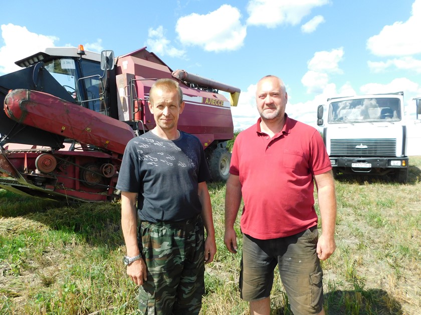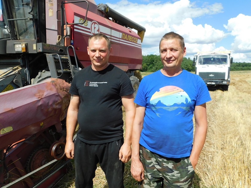 Яшчэ адна пара хлебаробаў — Ігар Мосін і Андрэй Талстых. Першы — камбайнер, два бункеры зерня адгрузіў, набіраў трэці. Вадзіцель Андрэй Талстых ганарыцца абранай прафесіяй. Жыве ў Беларусі 8 год, а малая радзіма — Казахстан. Мужчына ў дзень нашай сустрэчы зрабіў два рэйсы з поля на сушылку.