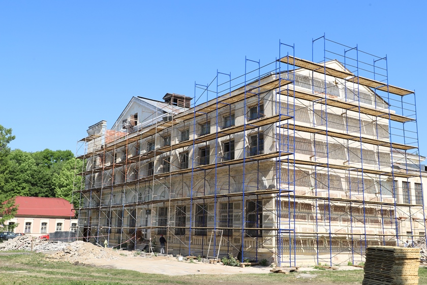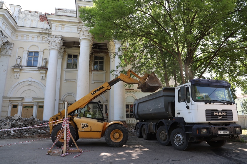 — На объекте задействовано 45 человек, выполняется комплекс работ внутри помещений: демонтаж полов, утеплителя чердачных перекрытий, дверей, окон, крылец, отмостки, проездов, частично — штукатурки. Начинается подготовка поверхности фасада под отделку, — сообщил директор ЧТПУП «Гравелит» Александр Балабаев.