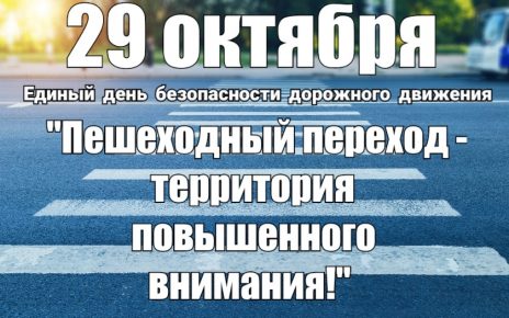 Продолжить чтение29 октября на Полотчине пройдёт Единый день безопасности дорожного движения «Пешеходный переход — территория повышенного внимания!».