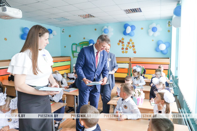 Перед первым традиционным уроком Сергей Лейченко и Ирина Дёминова вручили первоклассникам подарок от Главы государства – книгу «Беларусь – наша Радзіма». А для старшеклассников Сергей Дмитриевич провел занятие в форме открытого диалога «Нам есть чем гордиться, нам есть что беречь».