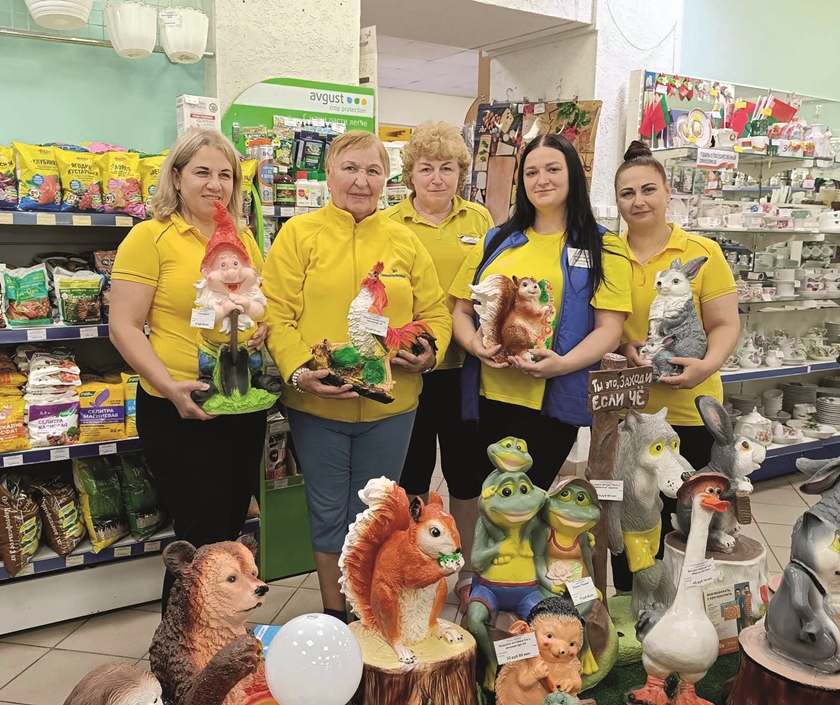 Вот где отрада для дачников и людей хозяйственных! Фунгициды, удобрения, посуда, садовые фигуры, грунт, инвентарь и многое другое. На фото: продавец Светлана Римша, уборщик помещений Тамара Зикрацкая, кладовщик Ирина Тавкинь, продавцы Виктория Защиринская и Наталья Лысенко.