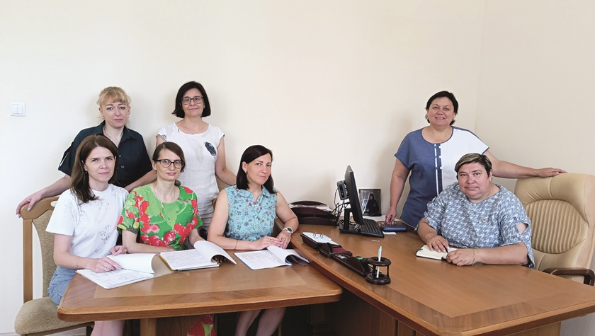 Юрисконсульт Ольга Луганская, специалист по кадрам Олеся Прокофьева, бухгалтер, председатель профсоюзного комитета Наталия Якубчёнок, бухгалтер Елена Лузгина, экономист Марина Пятница, главный бухгалтер Валентина Авласёнок, директор Татьяна Акимова.