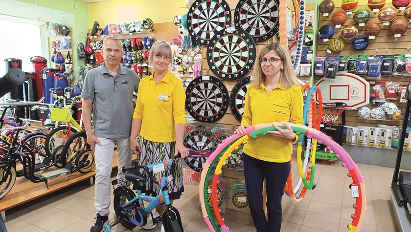 За спорттоварами для любителей единоборств, велосипедистов и туристов, за товарами для активного отдыха и строительными материалами (обоями, напольными покрытиями, ПВХ-панелями) — вам сюда. Выбор широкий, цены демократичные, консультации профессиональные. Есть тут и самокаты, и садовые качели, и даже кубки для чемпионов! На фото: заведующий магазином Анатолий Крыленко, продавцы Галина Ободова и Наталья Пряникова.