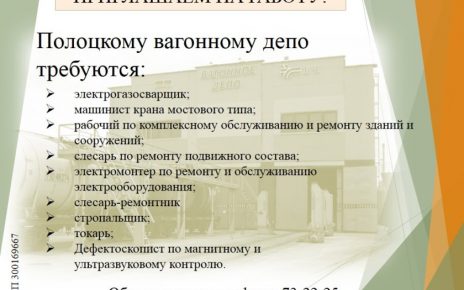 Продолжить чтениеПолоцкому вагонному депо требуется на работу: