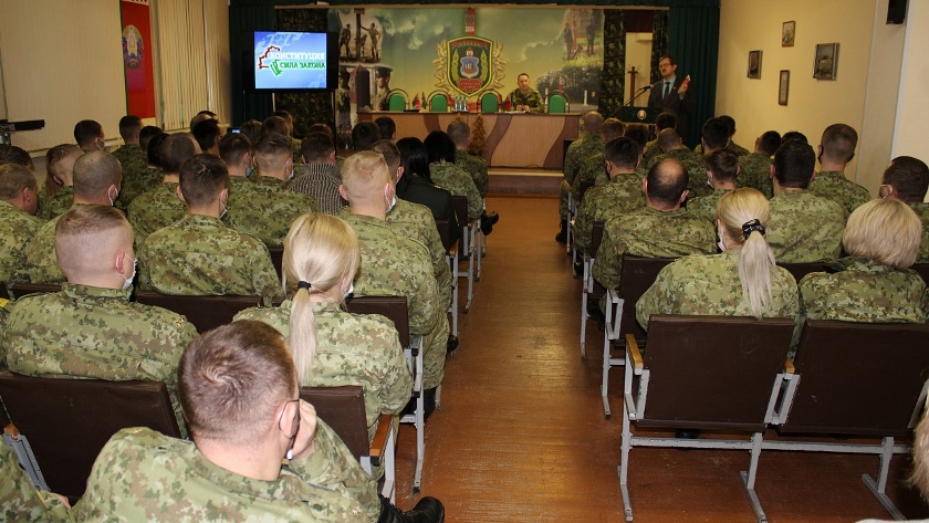 Перед началом выступления Олега Буевича к присутствующим обратился заместитель начальника пограничного отряда полковник Анатолий Михальчик. Он рассказал об истории подготовки Конституции Республики Беларусь, ее разделах, основных положениях.