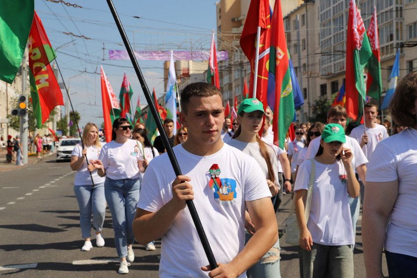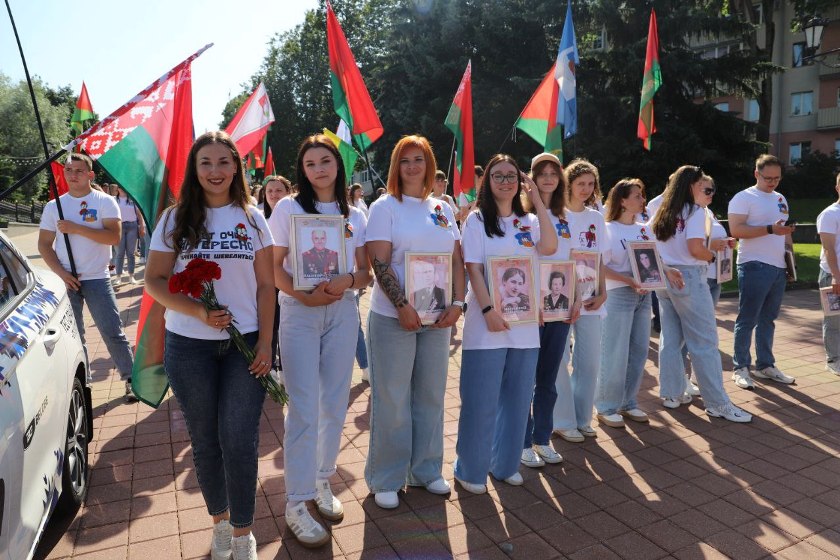 Среди участников — почетные гости и союзная молодежь. Шествие стало частью большой патриотической акции к 80-летию Победы советского народа в Великой Отечественной войне «Молодежь помнит».