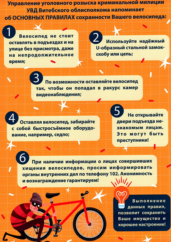 В связи с увеличением количества краж велосипедов, совершаемых путем свободного доступа, отдел внутренних дел Полоцкого райисполкома убедительно просит граждан не забывать о соблюдении элементарных правил, придерживаясь которых, вы сможете уберечь своё имущество от преступных посягательств и сохранить хорошее настроение:
