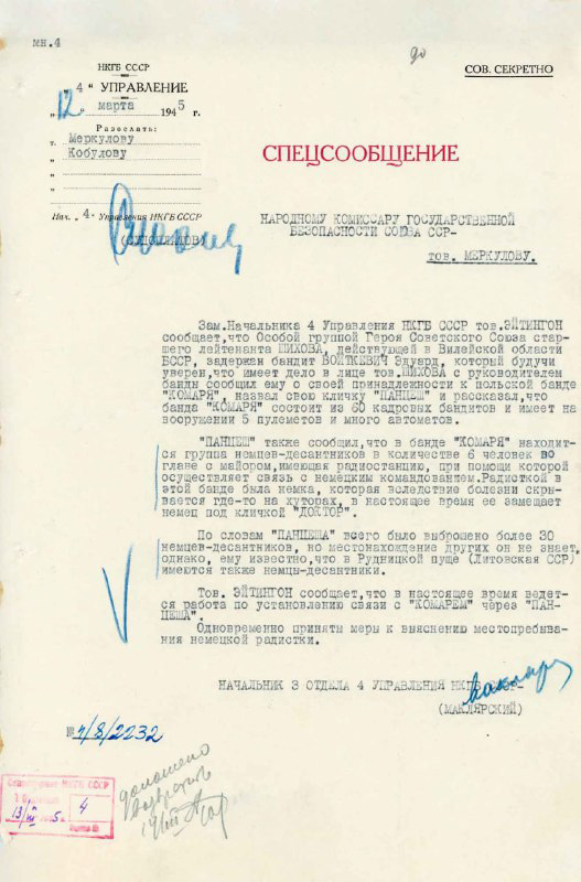 Из донесения начальника оперативной группы подполковника госбезопасности Прокопюка: «В № 83 от 7/3 — 44 г. газеты «Новый голос», издаваемой немцами на польском языке в Люблине, была размещена провокационная статья, озаглавленная «Красная армия получила приказ о ликвидации польских партизан». В статье опубликован липовый приказ командования партизанской бригады им. Сталина якобы о том, что «согласно приказу генерал-лейтенанта Пономаренко, намечаются аресты польских партизан».