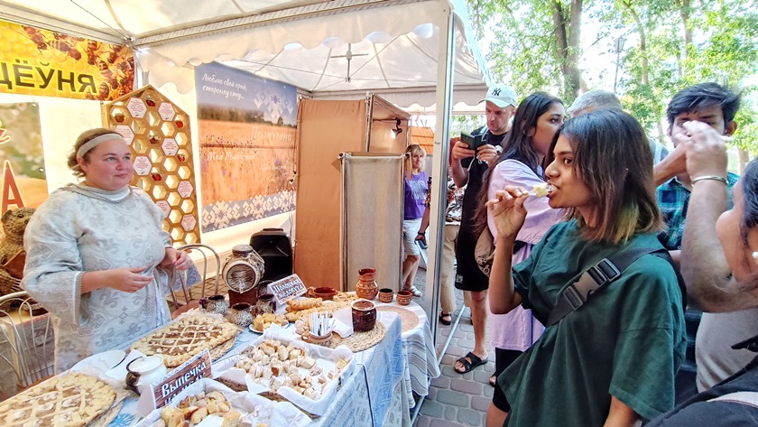 На площадке можно было угоститься выпечкой на меду и полоцкой медовухой, пройти дорогой князя Ольгерда, проверить эрудицию на знание редких диалектных слов, полюбоваться живым портретом «Неизвестной с корзиной в руках»…