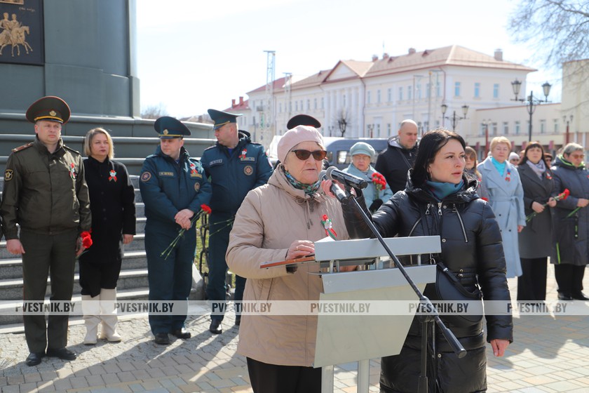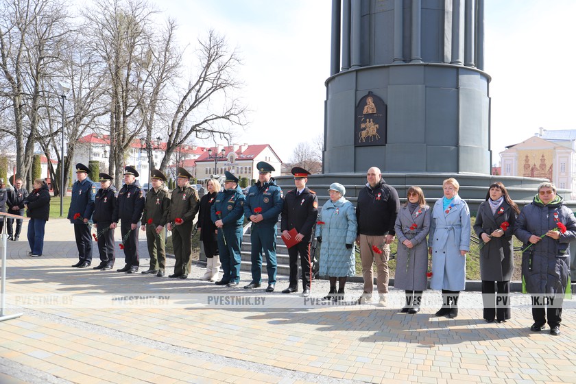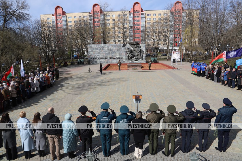Участники митинга почтили минутой молчания память узников фашистских концлагерей и возложили цветы к подножию памятника Освободителям Полоцка.