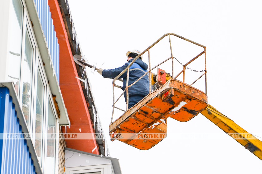 Отдельная тема – крыши. Все мы ждем тепла, но с его наступлением крыши начали активно «плакать», образуя – где быстрее, где медленнее — сосульки. Опасные зоны их падения и схода снежных пластов обозначают сигнальными лентами или ограждением. И в настоящее время КУП «ЖКХ г.Полоцка» на постоянной основе ведется работа по очистке крыш жилых домов от наледи и сосулек, для чего привлекается спецтехника. Ежедневно на очистку кровель задействовано 3 автовышки, 6 рабочих. Конечно, одномоментно это сделать невозможно. И следует понимать, что даже на очищенных крышах спустя несколько дней может снова образоваться частокол сосулек. Поэтому – не теряем бдительности!