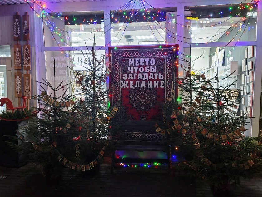 — Вместо стандартных западных новогодних украшений мы решили реализовать самобытный формат и создать яркие впечатления. Оригинальная композиция в стиле эпохи СССР объединяет многие поколения. Гирлянды из настоящих баранок, ковер на стене открывают портал в советское детство. Очень хочется поверить в чудо, загадать сокровенное желание, которое непременно сбудется, — поделилась Инна Просолович, владелица магазина.