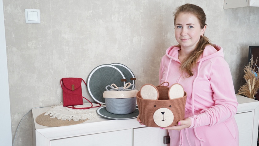 Анастасия Штукина умеет мастерить предметы из джута, но больше ей нравится хлопковый шнур, более упругий и удобный в работе. Никаких сложных инструментов не требуется — все изделия она создает при помощи рук и бытовой швейной машинки, которую купила, еще будучи в первом декрете. «Потому что знала: точно буду что-то творить», — рассказывает наша собеседница. И эта машинка, купленная в начале творческого пути, стала ее надежным помощником.