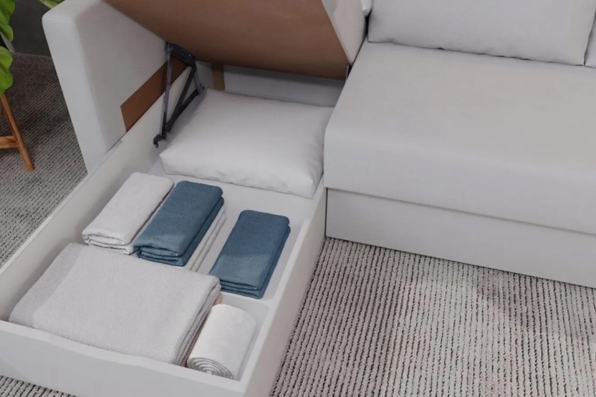 Практичное решение – мягкая мебель с встроенными системами хранения, например, с выдвижными ящиками или полками подходящих размеров. В этом пространстве можно хранить постельное белье, дополнительные подушки и одеяла, сезонную одежду или другие вещи. Такие ящики заменяют комод или полноценный шкаф. Интересные диваны со встроенными ящиками представлены в каталоге Аскона.